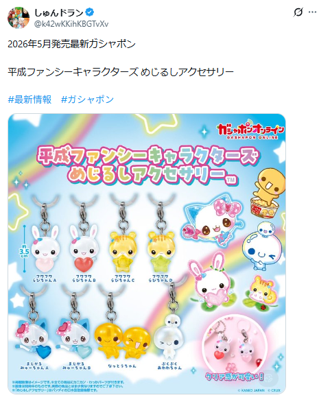 バンダイのガシャポンオンラインから「平成ファンシーキャラクターズ めじるしアクセサリー」が2026年5月に登場することが発表されました。傘の取っ手やペットボトルなど、自分の持ち物に可愛い目印を付けられるこのアイテムは、クリア素材の美しさが魅力です。カミオジャパンやクルックスといった当時の人気メーカーから生まれたキャラクターたちが勢揃いする、ファン垂涎のラインナップを詳しく紹介します。