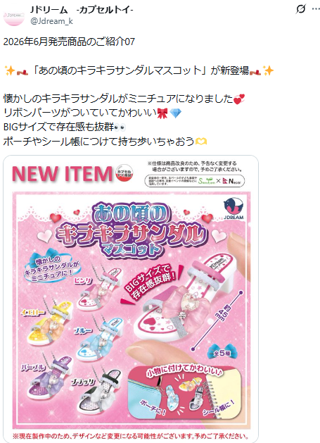 あの頃のキラキラサンダルマスコットは、2026年6月に全国のカプセルトイ筐体で発売される注目度の高い新作です。全5色のバリエーションとBIGサイズの存在感により、ポーチや持ち物を華やかに彩ってくれます。平成レトロな可愛さを手軽に楽しめるこのアイテムを、ぜひチェックしてみてください。