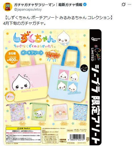 なんとこの商品、全国のカプセルトイ専門店「#C-pla(シープラ)」でしか手に入らない限定アイテムとなっており、早くも注目を集めています。発売は4月下旬が予定されており、実用性抜群のトートバッグ、巾着、ポーチの全6種類がラインナップ。どれが出ても日常使いしたくなる、ファンにはたまらないアソート内容となっています。今回はこの見逃せない新作ガチャガチャの詳細をいち早くお届けします。
