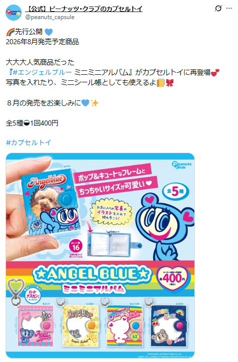 過去に大大大人気を博したエンジェルブルーのミニミニアルバムが、2026年8月にカプセルトイとして待望の再販を果たします。全5種類のカラフルでポップなデザインに、写真やシールを収納して持ち歩ける実用性抜群のアイテムです。前回買い逃してしまった方も、今回初めて知った方も、ぜひ発売時期にお近くのカプセルトイ売場をチェックして、お気に入りのデザインをゲットしてください。