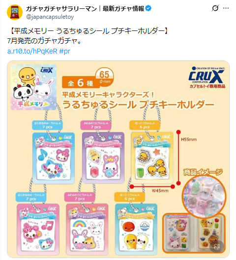 懐かしの平成キャラクターたちが、うるちゅる質感のシールキーホルダーとして復活する今回の新作は、世代を超えて愛されること間違いなしのアイテムです。全6種類のどれもが当時の記憶を呼び起こすエモいデザインとなっており、コンプリートを目指すファンも続出するでしょう。2024年7月の発売を見逃さないよう、今のうちから情報をチェックしておきましょう。