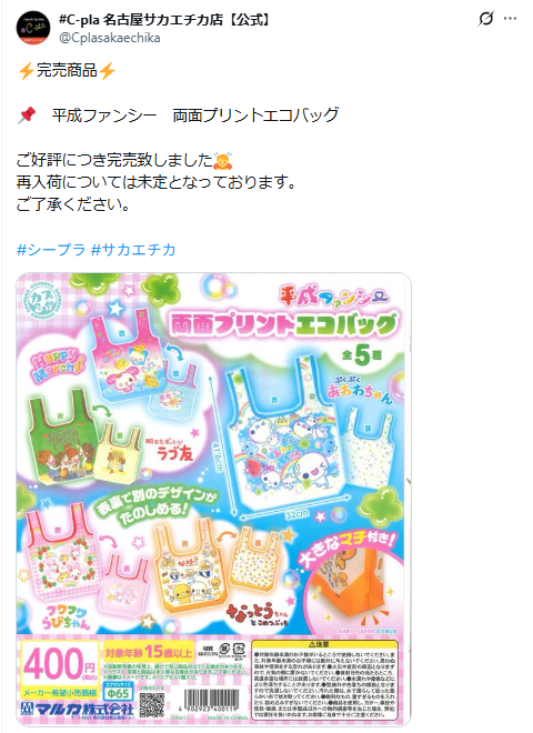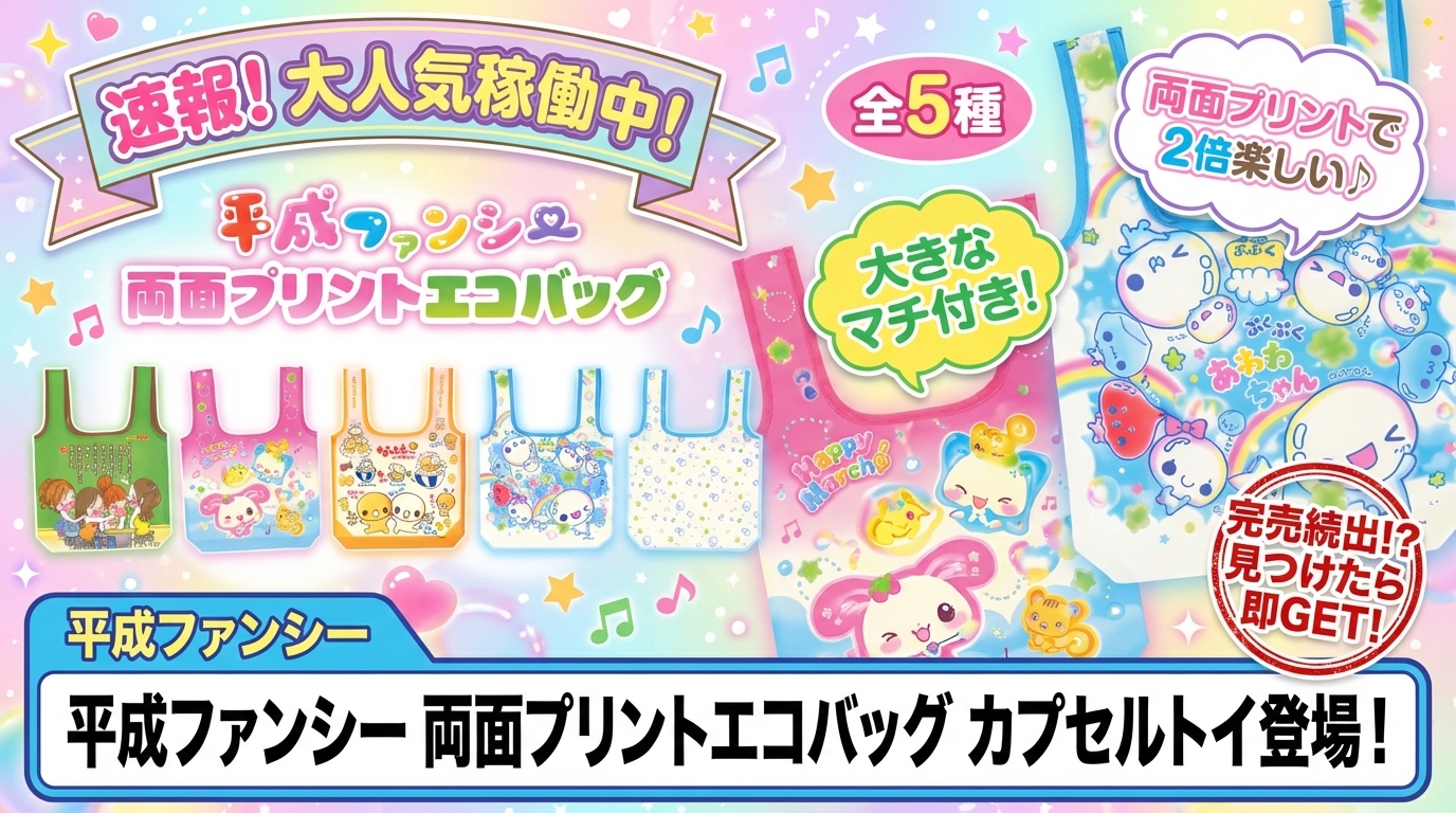 【新作】すでに完売店舗続出!?あの頃の懐かしいデザイン「平成ファンシー 両面プリントエコバッグ」がカプセルトイに登場!