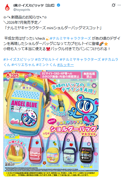 平成時代に社会現象を巻き起こした伝説の子供服ブランドたちが、令和の今、カプセルトイとして奇跡の復活を遂げます。株式会社トイズスピリッツから、当時のバッグデザインを忠実に再現した「ナルミヤキャラクターズ miniショルダーバッグマスコット」が2026年7月に発売されることが決定しました。